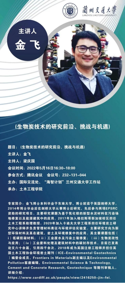 5月12日下午,应“海智计划”兰州交通大学工作站和土木工程学院联合邀请,英国卡迪夫大学金飞博士以线上视频会议方式作了题为“镁基水泥及其在污染土壤修复中的应用”的学术报告。此次讲座为我校“天佑海智云讲堂”系列活动,来自土木工程学院的相关专业师生参加了此次线上学术报告会。
