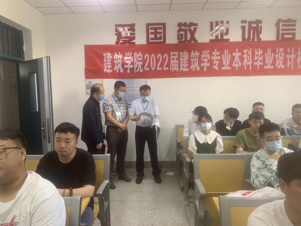 答辩期间,副校长刘振奎在教务处负责人的陪同下,到答辩现场对公开答辩工作进行了检查指导。刘振奎先后到文学院、土木学院、建筑学院和经管学院的汉语言文学、土木工程、建筑学、财务管理等专业的答辩现场,查看了答辩会场的组织安排和秩序效果,听取了部分同学的论文阐述、设计演示以及提问和回答情况,详细查看了同学们的毕业设计(论文)文本、图纸以及手册等资料。他认为,本届学生虽然受到疫情的一定影响,但在学校的有序安排下,指导教师线上线下有效衔接指导,线上线下答辩有机结合,总体达成了预期的效果,有效保障了学生大学期间最后一个重要的实践教学环节——毕业设计(论文)的质量。他指出,本次答辩现场得到了企业专家大力支持和现场把关指导,且不辞劳苦,态度严谨认真,值得尊重,校院级公开答辩能够起到良好的教育公平公正和教学严肃认真的作用,也为有效保障教学质量起到了重要的推动作用。