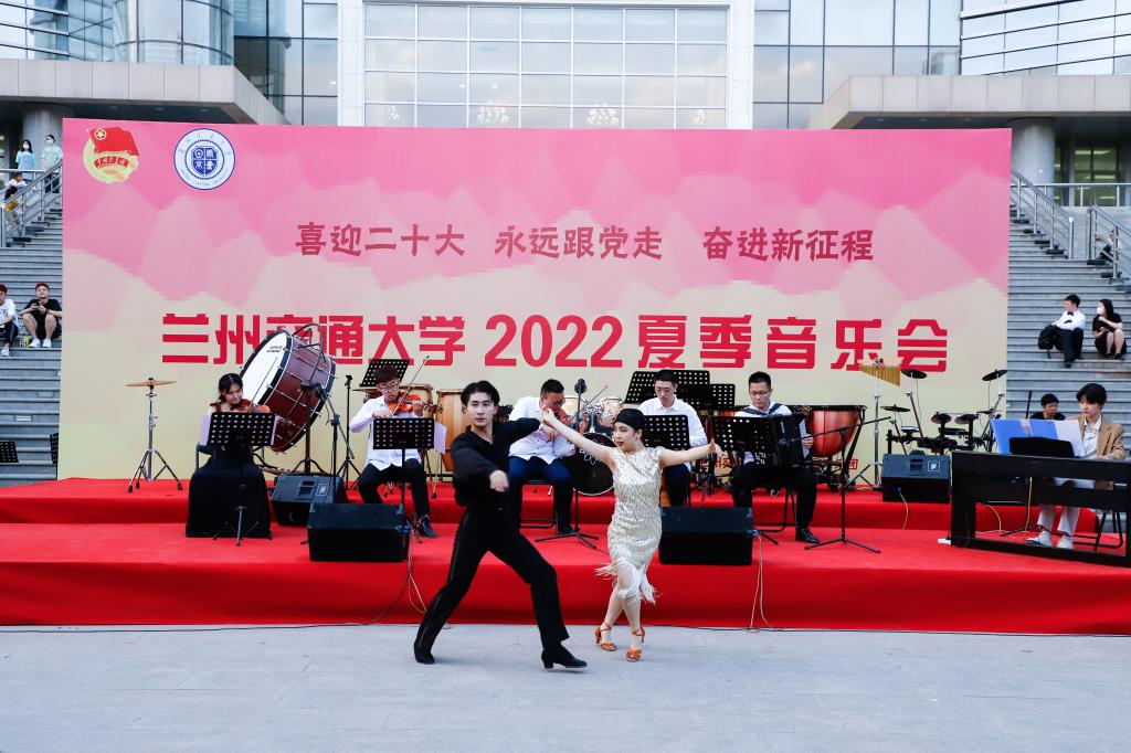 为迎接党的二十大胜利召开,庆祝中国共产主义青年团成立100周年,在2022届毕业生离校之际,6月12日,兰州交通大学大学生管乐团、大学生爱乐乐团在逸夫图书馆前举办了“喜迎二十大·永远跟党走·奋进新征程”2022夏季音乐会。
