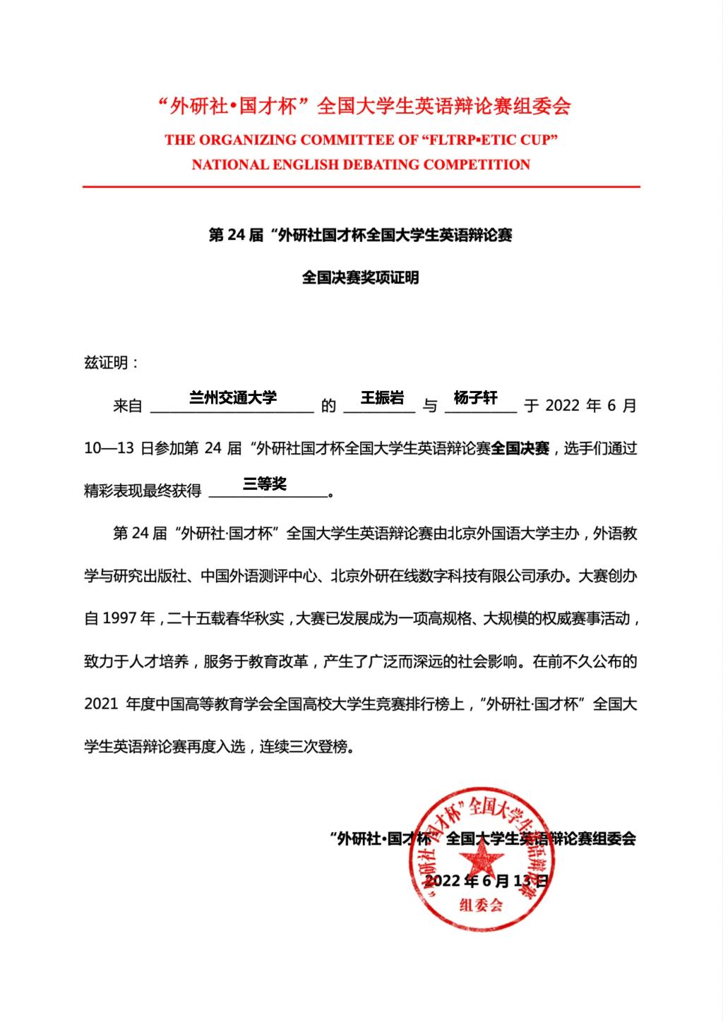 唇枪舌战尽显思辨锋芒,夺席谈经展现辩手雄风。近日,第24届“外研社·国才杯”全国大学生英语辩论赛决赛在互联网云端落下帷幕。由我校外国语学院张亚锋老师担任指导教师,英语2001班王振岩和英语1902班杨子轩同学组成的代表队获得全国赛三等奖。