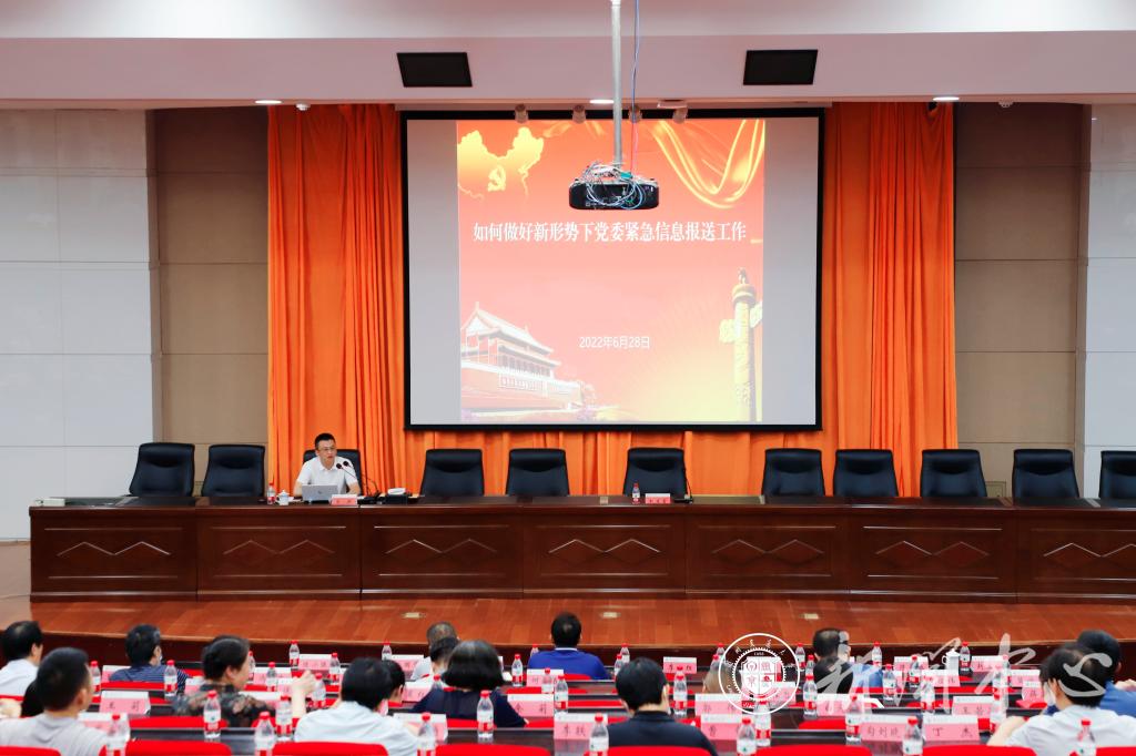 6月28日下午,省委办公厅应急信息处相关负责人做了《如何做好新形势下党委紧急信息报送工作》,通过丰富翔实的案件事例和深入浅出的讲解剖析,从不同角度、不同侧面,就党委信息工作提出了明确要求。讲座由党委组织部部长赵生吉主持。