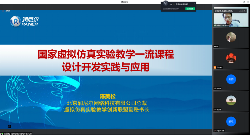 陈美松作了“国家虚拟仿真实验教学一流课程设计开发实践与应用”报告,分享了高校和企业分工合作、课程开发涉及的技术方案等方面的经验。