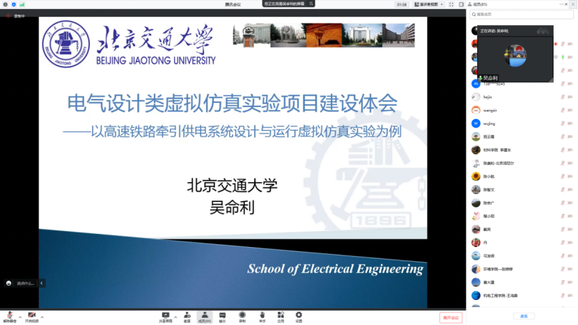 吴命利结合自己承担参加国评的“高速铁路牵引供电系统设计与运行虚拟仿真实验项目”,分享了电气设计类虚拟仿真实验项目建设体会。
