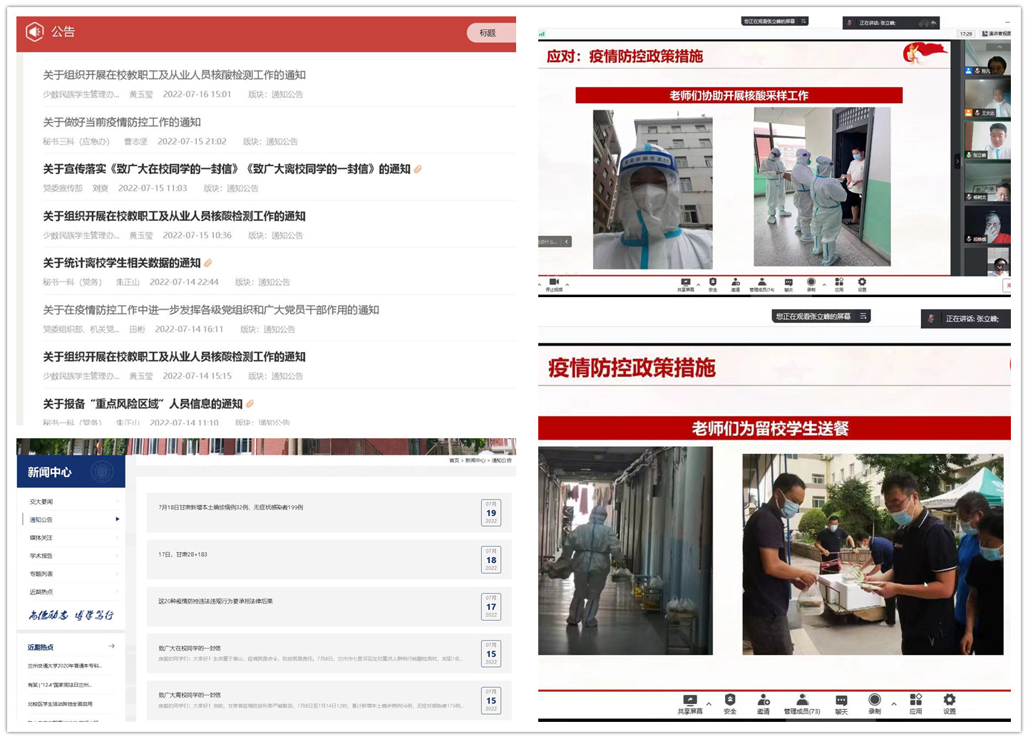 学校实施封闭管理期间,先后发布《关于调整学校暑期相关工作安排的通知》《关于疫情防控期间校领导包抓学生公寓楼的通知》《关于安排学生工作力量下沉留校学生公寓的通知》《关于在疫情防控工作中进一步发挥各级党组织和广大党员干部作用的通知》《致兰州交通大学全校研究生指导教师的倡议书》《致广大在校同学的一封信》和《致广大离校同学的一封信》激励全校党员干部、全校师生积极行动起来,践行责任与担当。在疫情防控一线守初心、担使命。