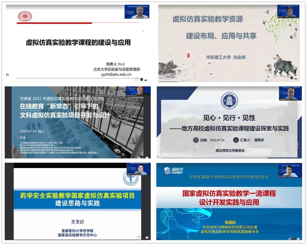 为贯彻落实《教育部关于一流本科课程建设的实施意见》,推进信息技术与实验教学的深度融合,加强实验教学优质资源建设与应用,促进实验教学资源开放共享,提高实验教学质量和实践育人水平,进一步推动实验教学改革与创新,7月19日,由甘肃省高校实验室工作研究会主办,兰州大学实验室与设备管理处和兰州交通大学实验管理中心承办,北京润尼尔网络科技有限公司协办的“甘肃省 2022 年虚拟仿真实验教学项目建设交流会”以线上方式顺利举行。全国共有167所学校982名老师参会,其中甘肃省40余所高校的825名老师参会,全国累计6789人次观看直播。会议由兰州交通大学实验管理中心相关负责人主持。