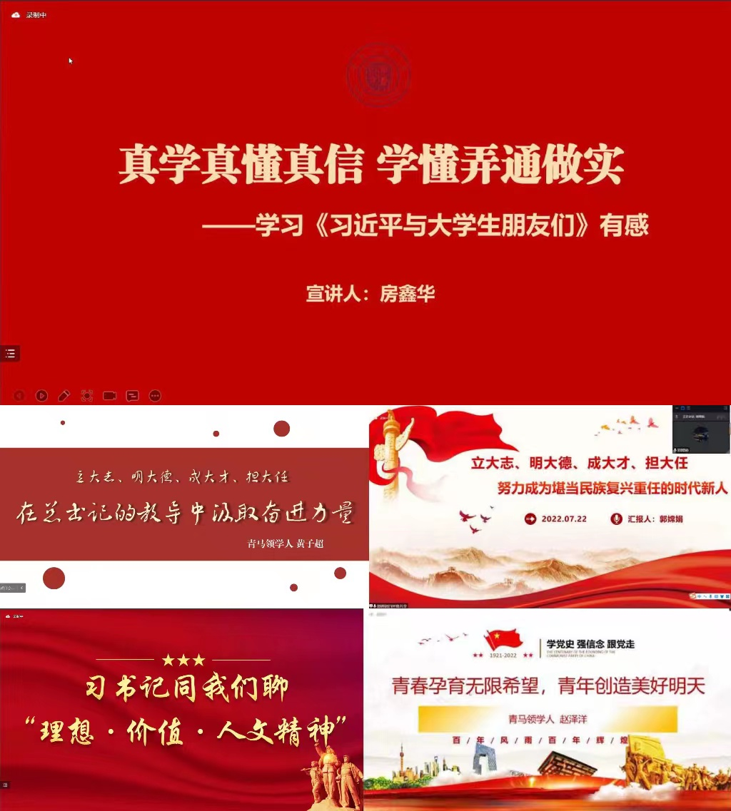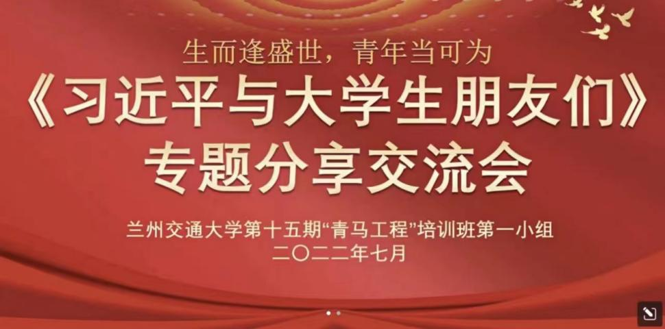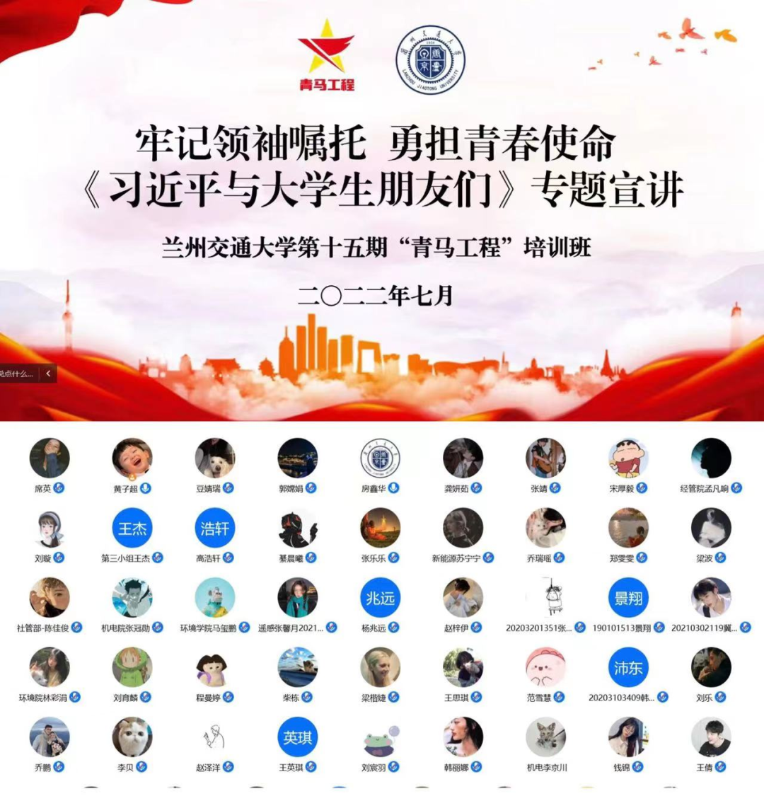 为迎接党的二十大胜利召开,7月22日,兰州交通大学第十五期“青马工程”结合“喜迎二十大 永远跟党走 奋进新征程”主题教育实践活动为引领,发动青马工程学生骨干,通过“学习+宣讲+实践”三位一体相结合的组织模式,开展“牢记领袖嘱托 勇担青春使命”——《习近平与大学生朋友们》线上专题宣讲会,在真学、真信、真用中感悟习近平总书记殷殷嘱托背后的句句温情。