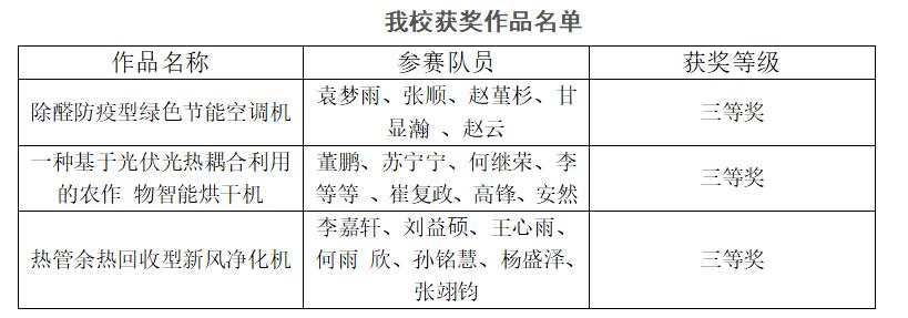 经过专家评审,初赛共选出1539件获奖作品进入会评,最终评出特等奖10项(0.16%),一等奖138项(2.22%),二等奖227项(3.65%),三等奖1164项(75.6%)。其中由我校环境与市政工程学院张健、周鸣镝、赵娟老师指导,建筑环境与能源应用工程2019级袁梦雨同学负责的作品“除醛防疫型绿色节能空调机”和建筑环境与能源应用工程2019级李嘉轩同学负责的作品“热管余热回收型新风净化机”及新能源与动力工程学院刘骥飞、张旭耀老师指导,新能源科学与工程2019级董鹏同学负责的作品“一种基于光伏光热耦合利用的农作物智能烘干机”获得三等奖,同时我校还获得“优秀组织奖”。