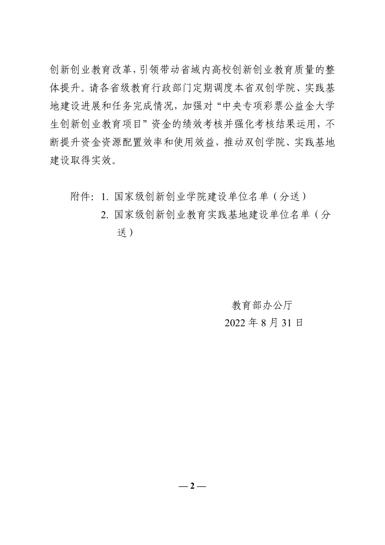 建设国家级创新创业教育实践基地是教育部全面贯彻落实《国务院办公厅关于进一步支持大学生创新创业的指导意见》(国办发〔2021〕35号),深化高等学校创新创业教育改革,加强创新创业人才培养,纵深推进大众创业万众创新的重要举措。教育部今年首次面向全国高校建设国家级创新创业学院和国家级创新创业教育实践基地。经自主申报、专家评审等程序,认定北京大学等100所高校为“国家级创新创业学院”建设单位,认定清华大学等100所高校为“国家级创新创业教育实践基地”建设单位。