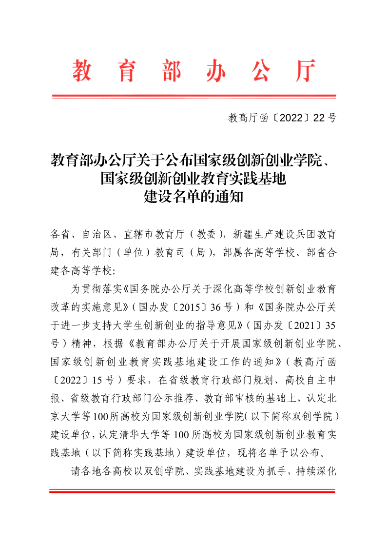 近日,教育部办公厅发布了《关于公布国家级创新创业学院、国家级创新创业教育实践基地建设名单的通知》(教高厅函〔2022〕22号),我校成功入选“国家级创新创业教育实践基地”建设单位。