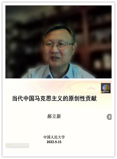 为认真贯彻落实学校党委的工作部署,持续深入学习习近平新时代中国特色社会主义思想,迎接党的二十大胜利召开。马克思主义学院以“学习新思想 迎接二十大”为主题举办“马克思主义理论名师大家”讲坛。9月15日下午,中国人民大学明德书院院长、博士生导师、教育部长江学者特聘教授郝立新应邀作了题为“当代中国马克思主义的原创性贡献”的首场线上学术报告。马克思主义学院全体师生、校内有关师生、兄弟院校思政课教师共计300多人聆听了报告,马克思主义学院院长蔡中宏主持报告会。