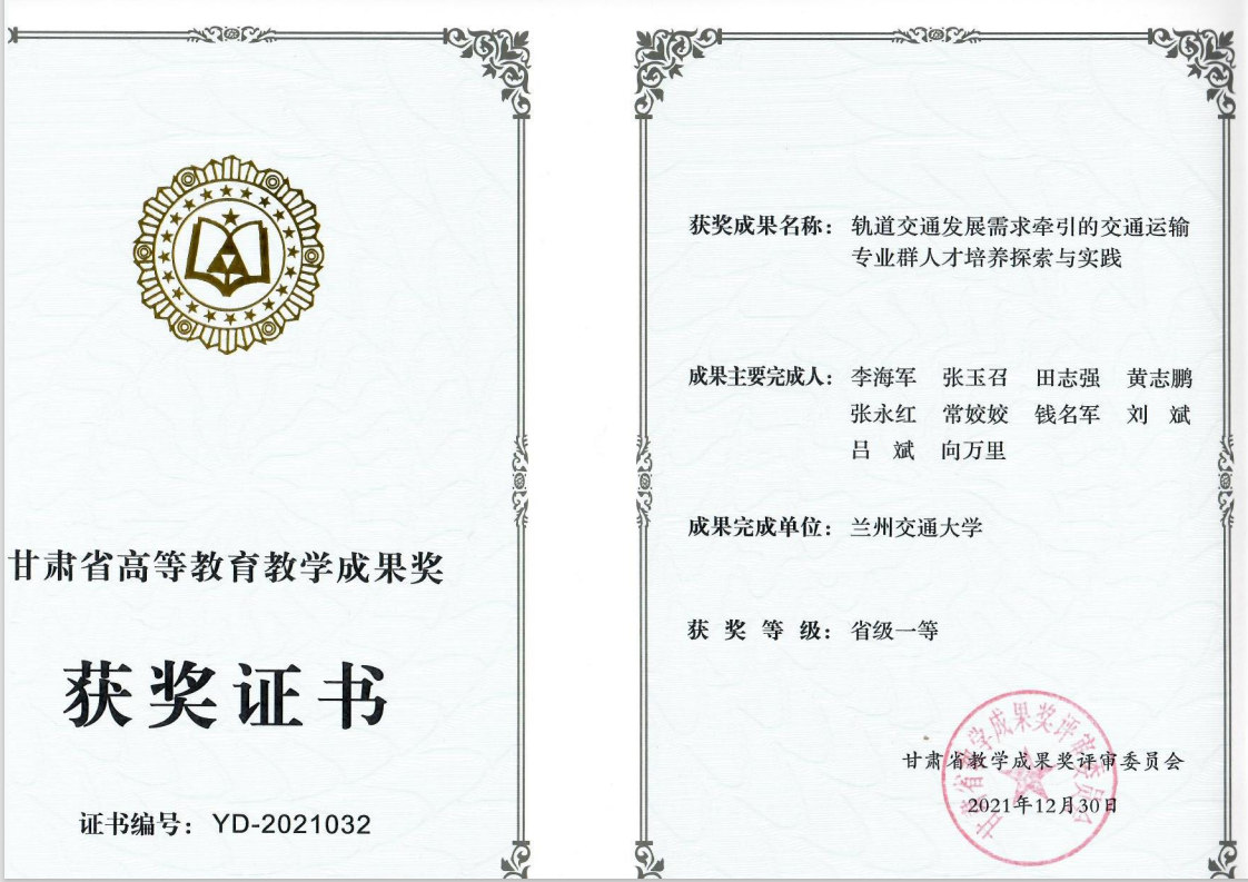 2009年“注重优势,突出特色,适应发展,交通运输专业创新人才培养模式的研究与实践”获国家教学成果二等奖。2021年获得省级教学成果特等奖1项、一等奖1项。累计共获得教育部高等学校专业教学指导委员会、中国交通教育研究会、中国物流学会、甘肃省等省部级教学成果奖30余项。