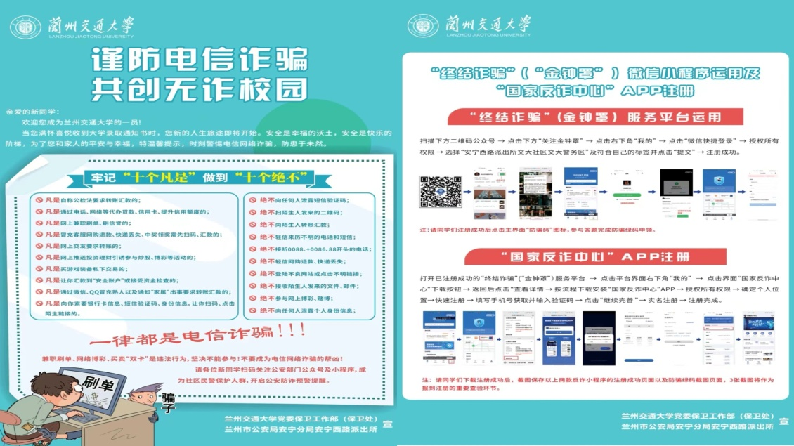 邮寄宣传彩页,免疫防范宣传。2022年招生录取工作开始后,保卫工作部会同招生就业处和安宁西路派出所,与录取通知书一并向全体新生邮寄《谨防电信诈骗 共创无诈校园》宣传彩页6000余份,就常见电诈类型与防范措施,“终结诈骗”(金钟罩)小程序的注册关注及“国家反诈中心”APP的下载安装,防骗绿码的答题申领等内容向新生进行了免疫防范宣传和安全教育。