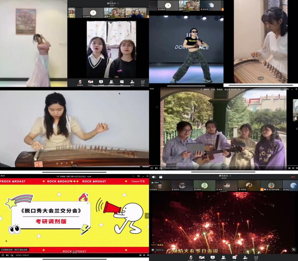 文学院举办了研究生线上文艺晚会。晚会以深情激昂的古筝合奏曲《东方红》和《万疆》拉开帷幕;朗诵《月光下的中国》展现了月光下一个宁静、温柔、祥和、美丽的中国,表达了对祖国深深的赤子之心;远在英国的赵亭同学带来的《武术表演》展现了中国传统文化的魅力和博大精深;歌舞、书法、剪纸、京剧等表演展现了同学们多才多艺的一面;《脱口秀大会兰交分会》展现了同学们的考研“心酸路”,引来笑声不断;晚会伴着歌曲《灯火里的中国》落下帷幕,唱出了灯火里的美好生活,展现了学子们对祖国的美好祝福以及对未来的欣然向往。