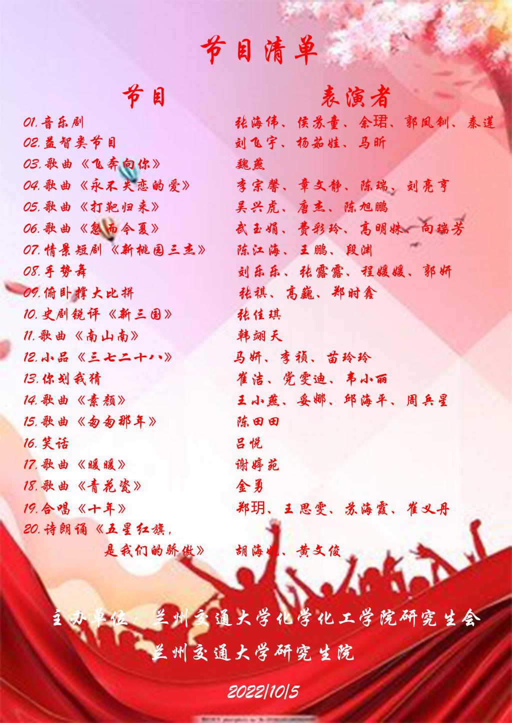 经济管理学院、数理学院、环境与市政工程学院、土木工程学院、自动化与电气工程学院、材料科学与工程学院、测绘与地理信息学院、电子与信息工程学院、生物与制药工程学院、外国语学院、机电技术研究所等多个研究生培养单位,均以各种大家喜闻乐见的形式,表达了对祖国繁荣昌盛的赞美之情和对现有幸福生活的歌唱与祝福。
