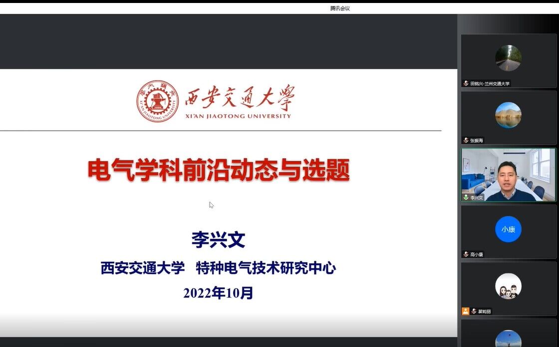 李兴文从国家“碳中和、碳达峰”战略需求层面分析了电气工程学科在可再生能源、智能电网等方面的最新发展方向,结合团队研究方向,先后介绍了新型电力开关设备、环境友好SF6替代气体及核电结构性能检测等方面的研究进展。最后,结合自身体会分享了做好科研工作的经验,鼓励大家用心做好科研,注重学科交叉与融合,为服务国家战略贡献力量。
