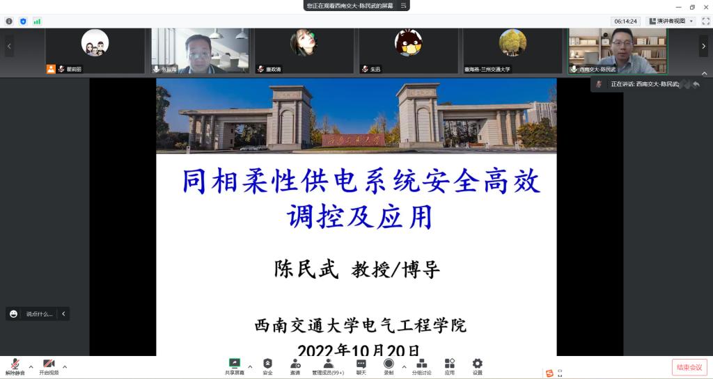 陈民武分析了在既有牵引供电模式下出现的三相不平衡电能质量、电力机车过分相以及供电能力匹配等问题已成为制约铁路供电系统安全、可靠和高质量运行的“瓶颈”。结合团队在同相柔性牵引供电系统方面的研究成果,系统介绍了牵引供电系统建模与运行特性、安全高效运行控制策略、全寿命周期优化配置等技术,并展示了研究成果在川藏铁路、京沪高铁等项目的工程应用与推广情况。
