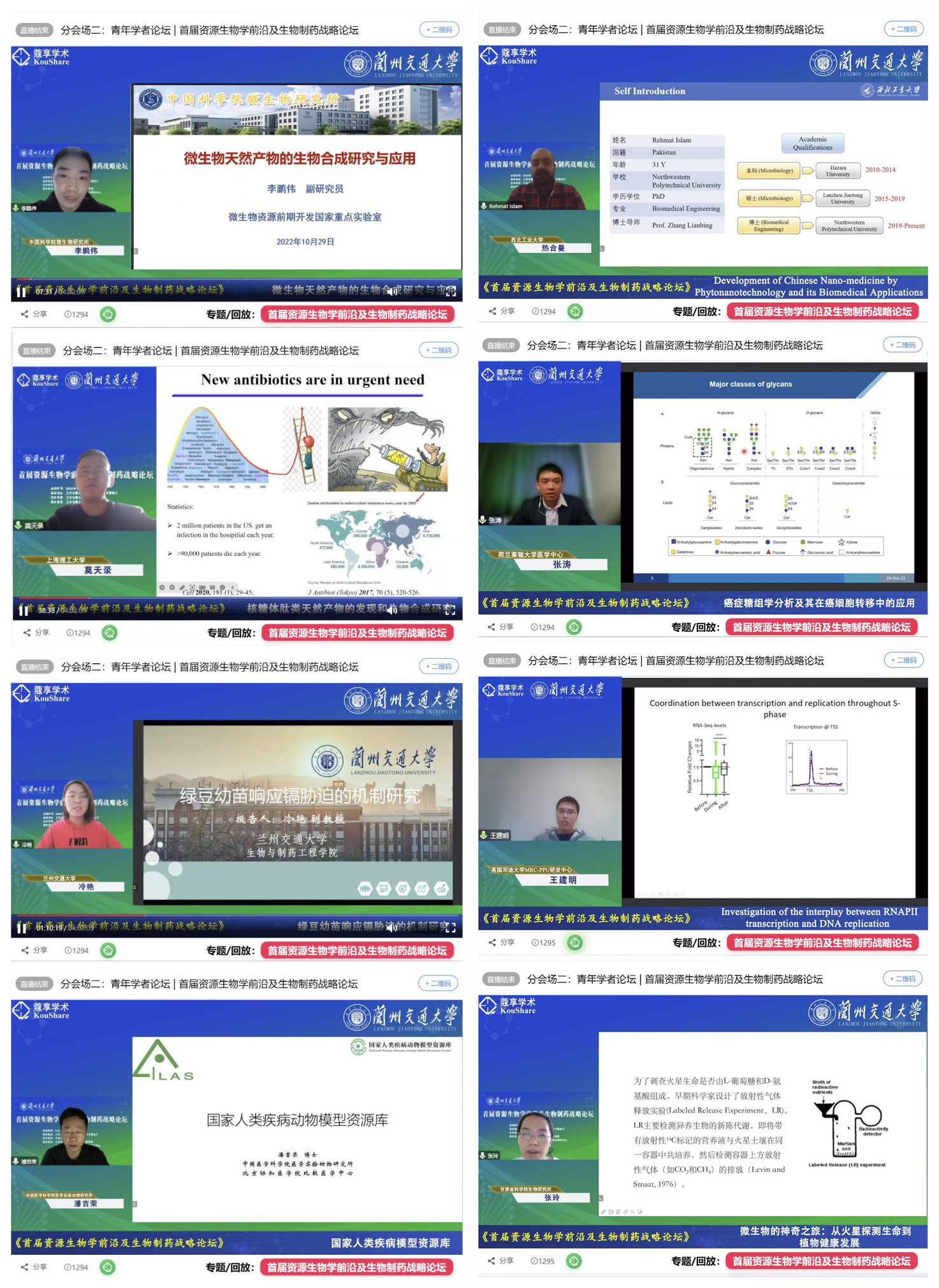 在“青年学者”论坛上,中国科学院微生物所李鹏伟博士分享了芽孢杆菌产生的聚酮类天然产物Aurantinin、谷氨酰胺蓝靛素的生物合成机制研究与应用。上海理工大学莫天录博士介绍了苏云金芽孢杆菌中分离纯化的塞克肽类化合的生物合成研究。兰州交通大学冷艳博士报告展示了植物抗氧化系统中重要的酶和抗氧化剂对Cd胁迫的响应机制和代谢通路。中国医学科学院潘吉荣博士报告题目为国家人类疾病动物模型资源库建设现状。西北工业大学热合曼博士介绍了生物纳米技术、植物纳米技术在新药研发的应用,展示了纳米技术在药物合成及复杂疾病治疗中的应用前景。荷兰莱顿大学医学中心张涛研究员分享了癌症糖组学分析及其在癌细胞转移中的应用。英国邓迪大学王建明博士作了基因转录和复制如何在DNA复制期相互协调作用以及他的重要发现。甘肃省科学院张玲博士介绍了微生物对氨基酸的手性选择在火星探测生命方案中的应用。“云上重返母校,师生携手创新”,本届论坛诚邀学校“生物工程”专业创办二十年来所培养的青年才俊代表,齐聚“青年学者”论坛,他们深情回顾刻苦求学的青春岁月,感恩母校的阳光哺育,祝福母校在新时代、新征程上取得更大更好的辉煌。