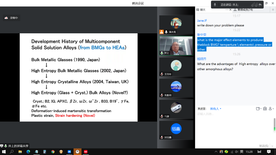 报告结束后,井上明久还与我校材料学科的教师和研究生进行线上交流,对青年教师需要关注的研究热点、块体非晶材料的研究应用和高熵非晶的研究前沿等主题进行了充分地讨论。