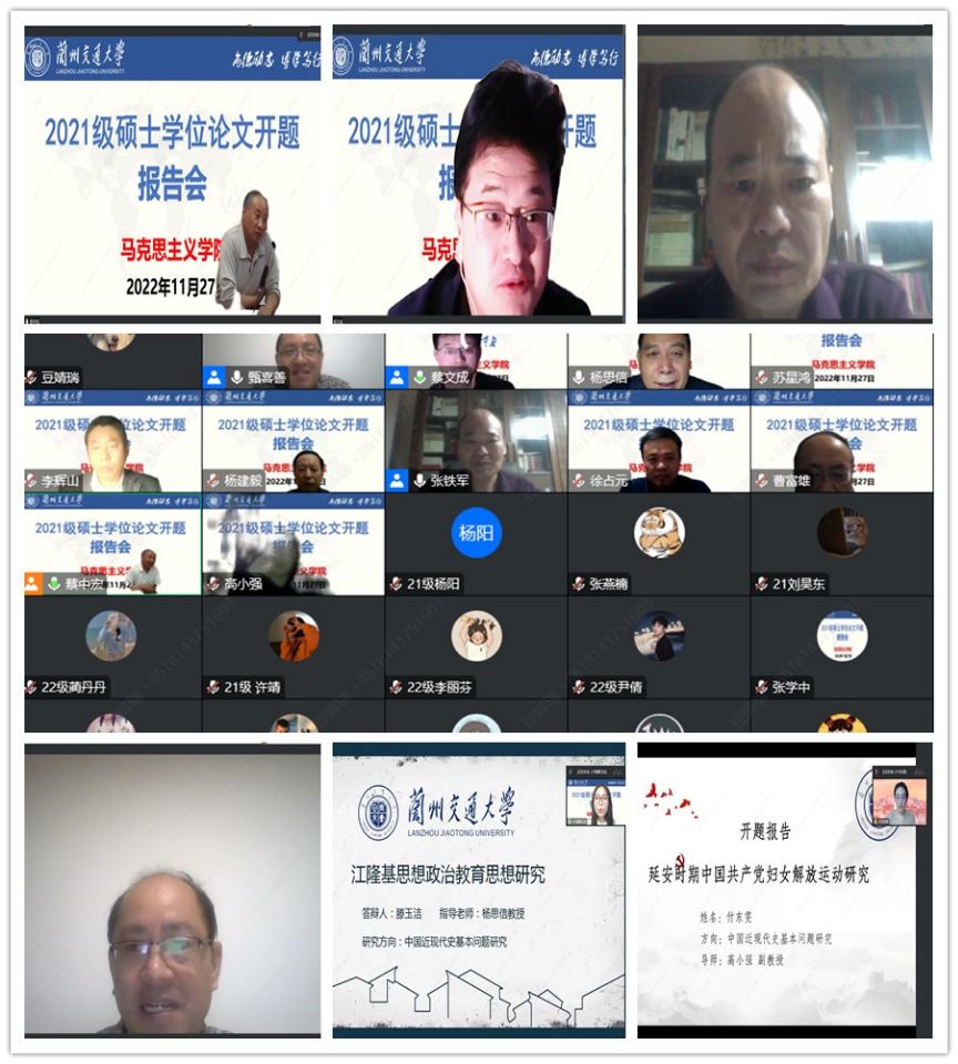 为深入学习研究阐释党的二十大报告精神,切实把好马克思主义理论学科研究生学位论文选题质量关,11月26日至27日,马克思主义学院邀请兰州大学马克思主义学院院长、博士生导师蔡文成等知名专家作主持人,以线上视频会议方式举行了2021级硕士研究生学位论文开题报告会。学院全体硕士研究生导师参加,2021级38名研究生作开题报告,2022级44名研究生全程参加旁听学习。