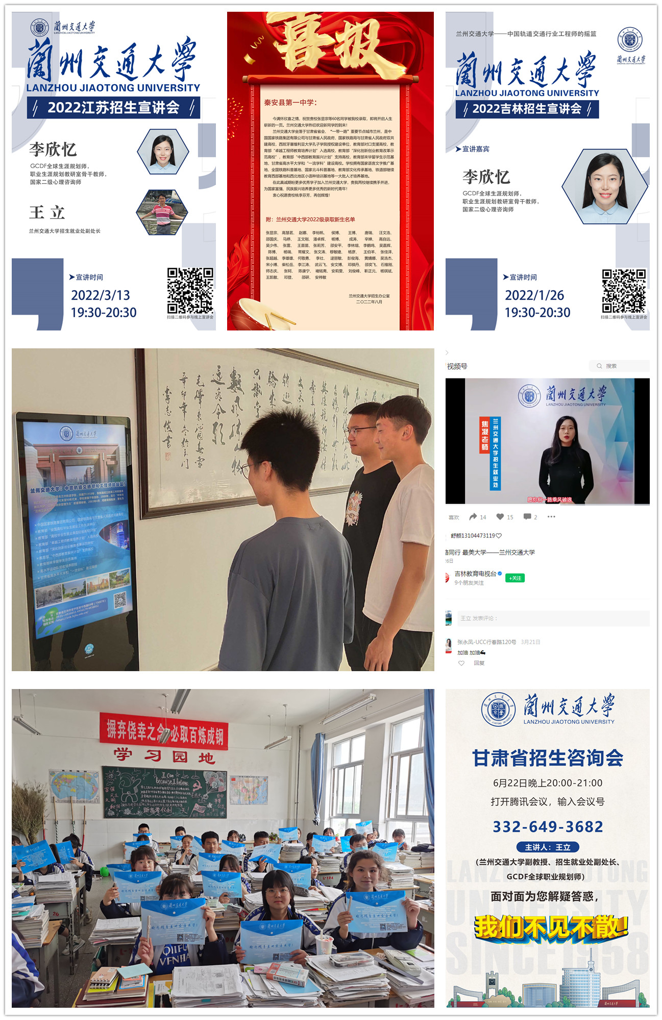 2022年,为提升招生宣传工作参与度,招生就业处相继下发了《兰州交通大学本专科招生工作宣传方案(试行)》(处发〔2022〕03号)和《关于组建兰州交通大学本专科招生宣传专家库的通知》(处发〔2022〕04号),建立了学院与外省和省内各地州的一一对接关系(每个学院对应一个外省和省内一个地市),明确了目标任务,动员全员参与招生宣传,着力打造一支专业化的招宣队伍,为我校本专科招生宣传工作赋能助力。去年共组织线上讲座、媒体访谈、直播连线等线上招宣活动80余场次,分4条线路赴省内各市州开展线下招生咨询会20余场次,收到了良好成效。