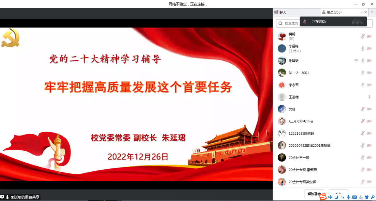 12月26日,校党委常委、副校长朱廷珺为分管和联系的后勤保障部、经管学院、铁道技术学院、MBA中心、继续教育学院、离退休教职工服务中心等6个单位的教工和学生党员作了党的二十大精神学习专题辅导报告,报告会在线上举行,共有师生党员270人聆听了此次报告,报告的主题为《牢牢把握高质量发展这个首要任务》。