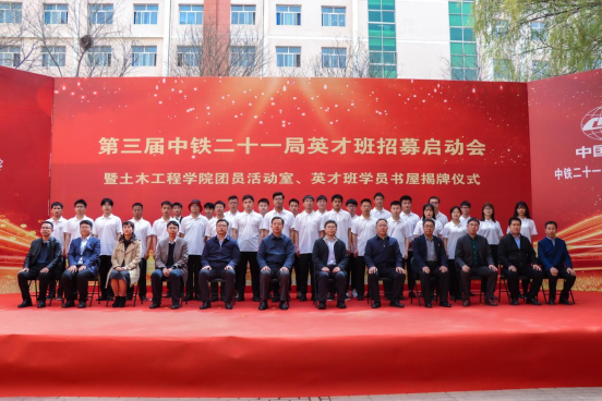 4月11日下午,中铁二十一局第三届英才班招募启动会暨土木工程学院团员活动室、英才班学员书屋揭牌仪式在北苑四号楼前广场举行。兰州交通大学副校长马军党,我校杰出校友、全国工程勘察设计大师汤友富出席,中国铁建党委组织部(人力资源部)、人才处,中铁二十一局人力资源部,学校招生就业处、公寓管理中心、土木工程学院相关负责人,第二届英才班学员、学校师生共200余人参加揭牌仪式。会议由招生就业处负责人主持。