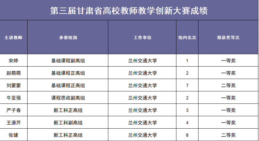 高校教师教学创新大赛是目前高校系统教师教学比赛类最高赛事,是更新教学理念、创新教学方法、推进教学改革的重要手段。本次大赛由甘肃省教育厅主办,大赛以“推动教学创新,培养一流人才”为主题,内容主要包括课堂教学实录视频、教学创新成果报告、教学设计创新汇报三个方面,通过校赛、省级网络评审和现场评审,共评选出第三届甘肃省高校教师教学创新大赛一等奖15项、二等奖25项、三等奖34项。