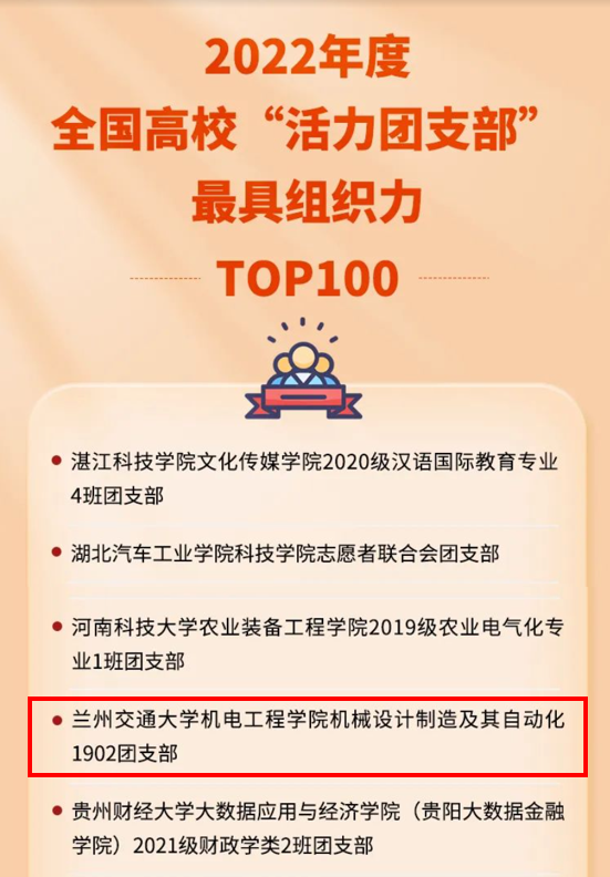 为深入贯彻“全团抓思想政治引领”“全团大抓基层”“全团抓学校”工作部署,激发高校团支部活力,团中央基层建设部指导中国青年报社开展了2022年度高校“活力团支部”风采展示活动。经学院申报、校内选树、省级推荐、展示点赞等环节,我校机电工程学院机械设计制造及其自动化1902团支部入选2022年度全国高校“活力团支部”最具组织力TOP100榜。