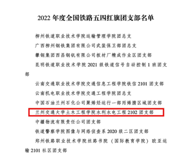 全国铁道团委授予我校机电工程学院团委“全国铁路五四红旗团委”荣誉称号、授予我校土木工程学院水利水电工程2102团支部“全国铁路五四红旗团支部”荣誉称号。