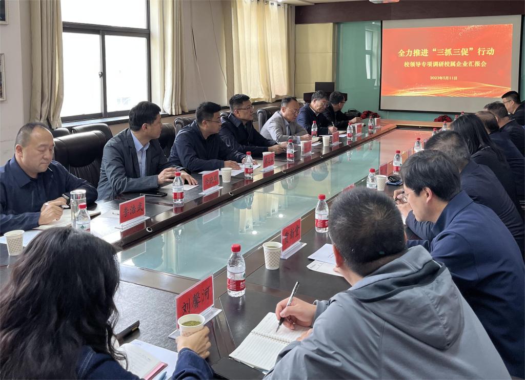 现场调研结束后,贡力一行在科技园孵化楼315会议室进行了座谈交流。座谈会上,各企业相关负责人从企业主责主业、企业生产经营情况、科研投入与成果转化情况、企业支持学校教学科研以及服务地方经济、担当社会责任情况、企业股权结构、法人治理结构、组织结构及人力资源情况、企业安全生产制度建设与落实情况、企业发展目前面临的最大困境和亟待解决的问题等方面进行了汇报。听取汇报后,贡力对各校属企业在建设运营、反哺学校教育、促进科技成果转化、地方财税、提供就业岗位等方面作出的成绩表示了肯定。贡力从定位、服务和目标三方面对校属企业提出了三点要求:一是提高政治站位,依法依规经营;二是企业法人负责,确保综合安全;三是全员共同努力,提升企业能力。贡力表示,各校属企业要深入贯彻学习学校第十二次党代会精神,全面落实学校“三抓三促”行动方案中的根本任务;进一步加大科技创新投入,争做“高科”企业;不断提升企业能力,加大反哺学校教育事业的力度。