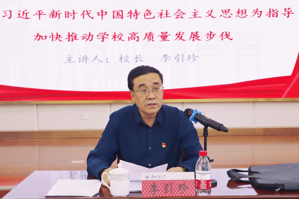 李引珍深刻阐述了习近平新时代中国特色社会主义思想的时代意义、科学体系和精髓要义,带领全体与会人员一起回顾学校发展历史和办学历程,并结合学校当前实际,以习近平新时代中国特色社会主义思想为指导,为新时代推动学校高质量发展提出思路和要求。