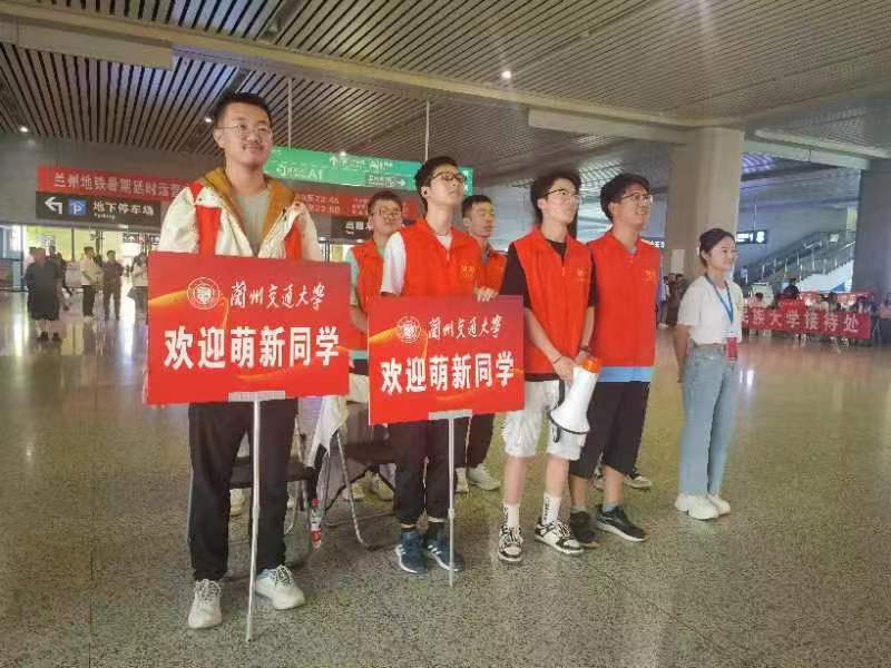迎着晨光,在兰州西站出站口,兰州交通大学迎新志愿者高高举起欢迎新同学的指示牌,热情欢迎来自五湖四海的新同学,温暖开启新生报到第一站。