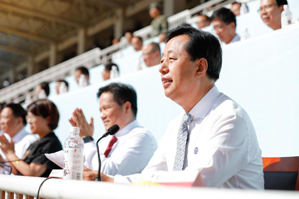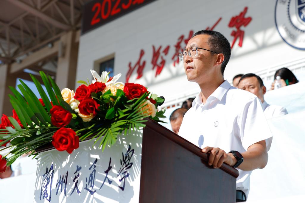 狄生奎代表学校向全体2023级新生表示诚挚的欢迎,并对承训教官致以衷心的感谢和崇高的敬意。他表示,兰州交通大学始终同祖国共发展,与时代共命运,扎根西北,不忘初心,筚路蓝缕、砥砺前行。在65年的艰苦耕耘中,学校坚定地走出了一条以轨道交通为核心的特色办学之路,发展成为一所行业特色鲜明、服务地方能力突出、享誉国内、在西北地区轨道交通建设中具有不可替代性的高等院校。进入新时代,学校深入学习贯彻党的二十大精神,全面落实“科教兴国”“交通强国”发展战略,全面落实立德树人根本任务,立足甘肃,放眼全国,充分发挥轨道交通行业优势特色,秉持交通大学“严谨治学、严格要求”的优良传统,弘扬“共享互通、开拓创新、不畏难险”的交通精神,着力推进国家一流学科建设,注重学生的价值塑造、意志激发、知识探究与能力培养,坚持以高质量发展为生命线,充分发挥高等教育龙头作用,努力办好人民满意的教育,践行教育强国实践,继续书写中西部高等教育振兴兰州交大新篇章。