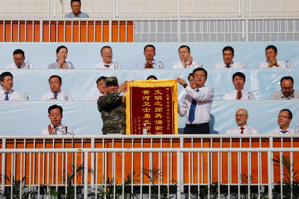 为向武警甘肃总队为我校的国防教育做出的卓越贡献表示感谢,党委副书记贡力向武警甘肃总队某支队政委邹拴社赠送锦旗。