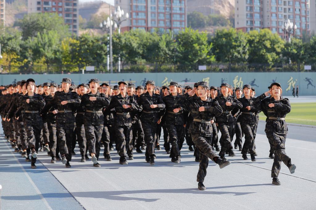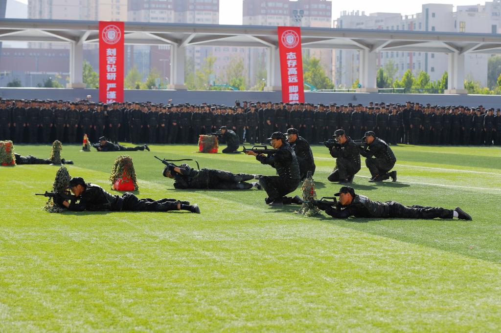 军事训练成果汇报表演中,新生学员先后进行了花束方阵表演、擒敌操展示、匕首操展示、警棍展示、战术展示等表演。花束方阵表演,巾帼不让须眉,动作规范,步调一致,掌声不断。同学们通过变换手中扇形花束和阵型变换展示出变化多样的数字效果和“中国”“65”等文字字样,来表达自己对党和祖国的热爱以及对学校65周年华诞的祝福;擒敌操虎虎生威,血气方刚,一招一式散发着无人能敌的自信;匕首操干净利落,警棍术气势如虹。同学们以嘹亮的口号,展现青春风采,喊出时代强音;战术展示表演中,灵敏的侦察、精准的信息传递、利落有效的火力打击、灵活的队形变换、一招制敌的近身格斗赢得现场阵阵掌声。执训教官带来倒功操展示,英姿飒爽,整齐划一,展示出军人服从命令、听从指挥的优良作风。