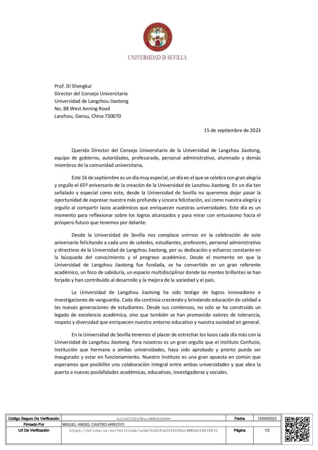西班牙塞维利亚大学、英国卡迪夫大学、马来西亚拉曼大学、台湾地区静宜大学等多所国(境)外高校,在对学校建校65周年表示祝贺的同时,也对我校65年来所取得的办学成就给予了高度评价,对我校未来的发展表达了美好的祝愿。各合作院校表示,将与我校在以往友好合作的基础上,进一步拓展合作领域,提升合作层次,互惠共赢,交流互鉴,共同创造友好合作的美好未来。