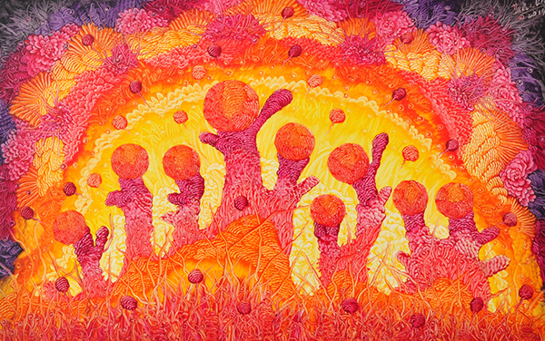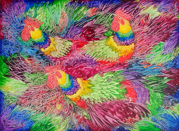 蓝充的作品善于借用西方形式语境,把真实的内心与幻境的想象融合起来,巧妙地表现出了中国精神和中国气派,通过瑰丽奇幻的线条点滴,抽象变形的形式意味,呈现出独有的视觉张力和绚烂斑驳、流动飞扬的色彩感触,寄托着对历史和人生际遇的感怀、倾诉与包容。使观众在享受视觉盛宴的同时,更亲身感受到了艺术引领生活所带来的无尽乐趣。