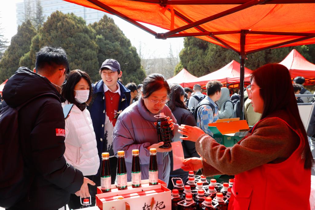 康乐县富康农投、西北牛、康美、新华等企业带来了品类丰富的农特产品,有牛羊肉、牛肉酱、香菇酱、香肠、木耳、松茸、香菇、灵芝、羊肚菌、黑枸杞、红枸杞、当归醋、菜籽油、胡麻油、拌面、草莓等,活动现场吸引了众多师生和家属前来选购。