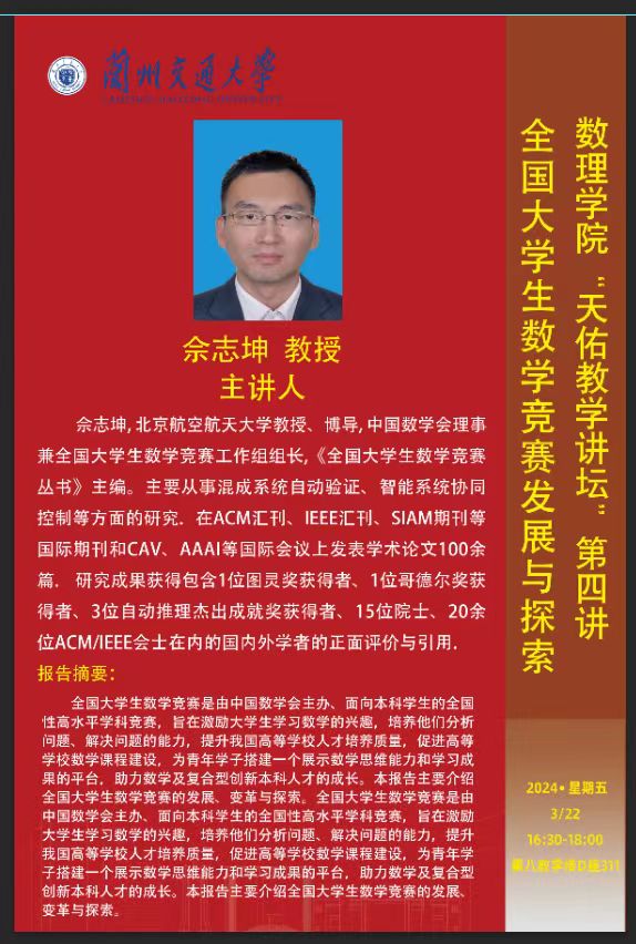 佘志坤作了题为“全国大学生数学竞赛发展与探索”的学术报告。报告围绕全国大学生数学竞赛的发展、改革与探索三个方面展开, 从竞赛的定位、内容、评奖等多方面进行介绍,强调竞赛是以赛促学、以赛促教、普及为主、选拔为辅, 为青年学子搭建一个展示数学思维能力和学习成果的平台。他建议大学生注重基础课程的学习, 打下扎实的基础, 鼓励同学们积极参加竞赛。