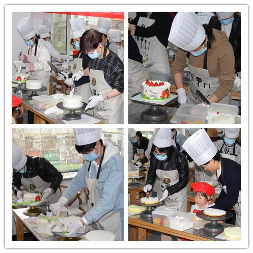 活动第二阶段为DIY蛋糕制作体验。在工作人员引导下,大家系上围裙、戴上手套和高高的白色厨师帽,经过严格的消毒流程进入制作室。大家仔细倾听,认真观摩专业烘焙老师的讲解示范,切蛋糕、抹奶油、围围边、挤花边、装饰水果,很快进入角色,手艺娴熟地按照自己的设想制作蛋糕。活动现场阵阵欢声笑语,老师们体验着自己动手DIY的制作乐趣,分享着温馨甜蜜的烘焙时光。