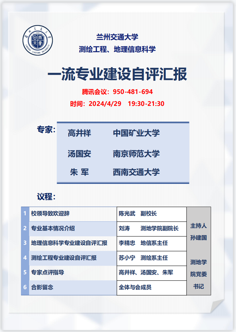 4月29日晚,我校线上召开了地理信息科学、测绘工程国家级一流本科专业建设点自评会。副校长陈光武出席,测绘与地理信息学院领导班子、各系室负责人、专业负责人和教师代表参加了会议。会议旨在为地理信息科学、测绘工程专业发展把脉问诊,扎实推进专业内涵建设,提升专业发展质量。