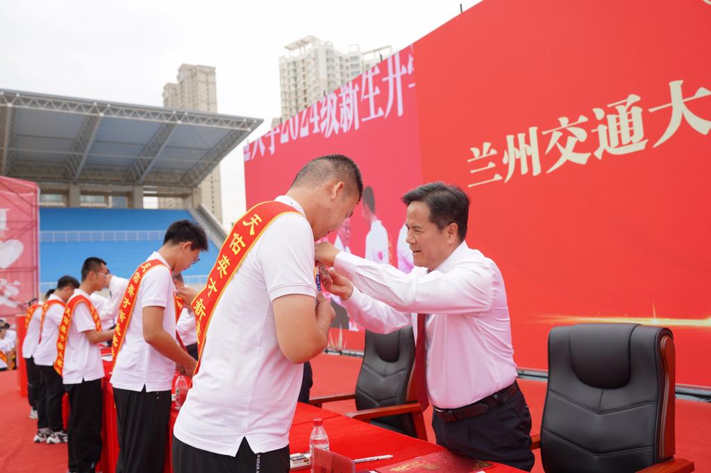 典礼上举行了新生佩戴兰州交通大学校徽仪式。校领导为新生代表戴上了“兰州交通大学校徽”,全体同学将校徽庄重佩戴在胸前。胸前闪耀的校徽,是肩上责任,是心中理想,更让每一位新“交大人”脚下充满力量。从此,每一名新生便与兰州交通大学血脉相连,他们将“尚德、励志、博学、笃行”的校训铭记在心,把青春融入党和人民事业,向着奋进之路、逐梦之旅出发。