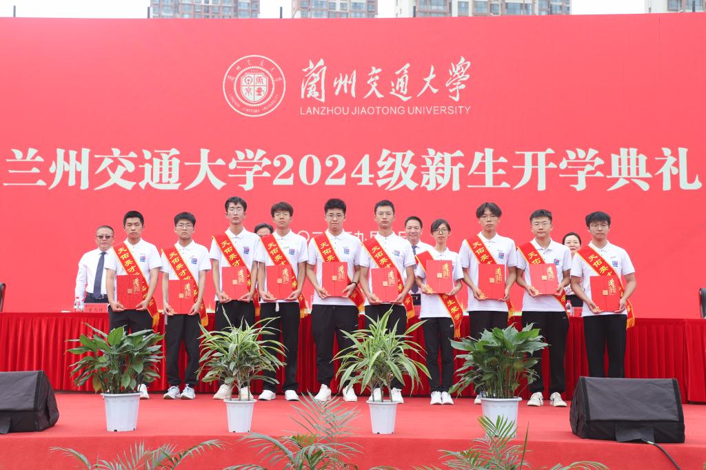 朱廷珺宣读兰州交通大学“天佑英才”新生奖学金获得者表彰决定。经学校评审,75人获兰州交通大学“天佑英才”新生奖学金。校领导、校友代表为“天佑英才”新生奖学金获得者代表颁发证书。