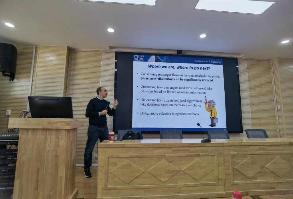 座谈结束后,安德里亚·德·埃里亚诺教授做了题为《突发情况下基于客流组织的列车运行图优化》的讲座,并与交通运输等相关学术领域师生进行了深入交流。