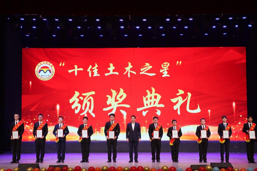 晚会现场还进行了土木工程学院第六届“十佳土木之星”颁奖典礼。学院在“博学、科研、励志、进步、双创、实践、志愿、文艺、体育、宣传”十个方面表现优异的学生依次登台展示,现场播送学院授予每位同学的颁奖词。朱廷珺为获奖同学颁奖,激励着在场的全体2024级学生从身边的榜样中汲取力量,明确个人志向,树立崇高目标,不断提升自身的专业素养与综合能力,努力成长为有理想、有本领、有担当的新时代青年。