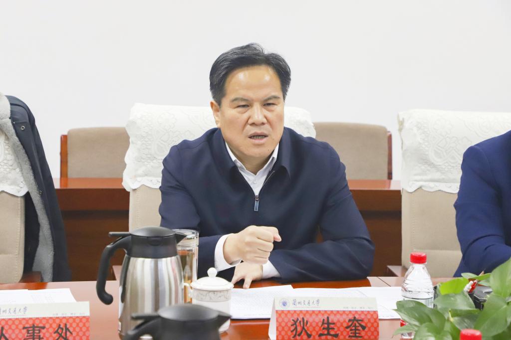 狄生奎对侯忠明一行表示热烈欢迎,并简要介绍了学校历史沿革、发展现状与学科特色。他表示,作为新中国创办的第三所铁路本科院校,兰州交通大学立足甘肃,放眼全国,走出了一条以轨道交通为核心的特色办学之路,被誉为中国铁路工程师的摇篮。学校始终以服务行业和地方经济社会发展为己任,牢牢把握新时代西部大开发和甘肃加快建设振兴中西部高等教育改革先行区等重大战略机遇,锚定“1152”奋斗目标,坚定不移走内涵式高质量发展之路,努力为教育强国、交通强国和科教兴省战略实施贡献智慧和力量。四川文理学院秉承“博文大理,厚德笃行”的校训精神,弘扬“艰难困苦,玉汝于成”的办学精神,立足应用型办学定位,依托巴文化的深厚积淀,吸取古今优秀教育理念和中外教育改革最新成果,为社会培养了10万余名专业基础深厚,富有实践能力和创新意识的优秀毕业生。希望两校通过此次座谈交流,进一步加强交流互动,共享在人才队伍建设、综合改革、学校治理等领域的经验。