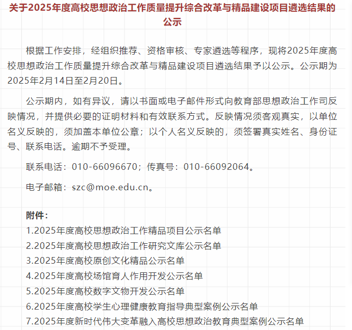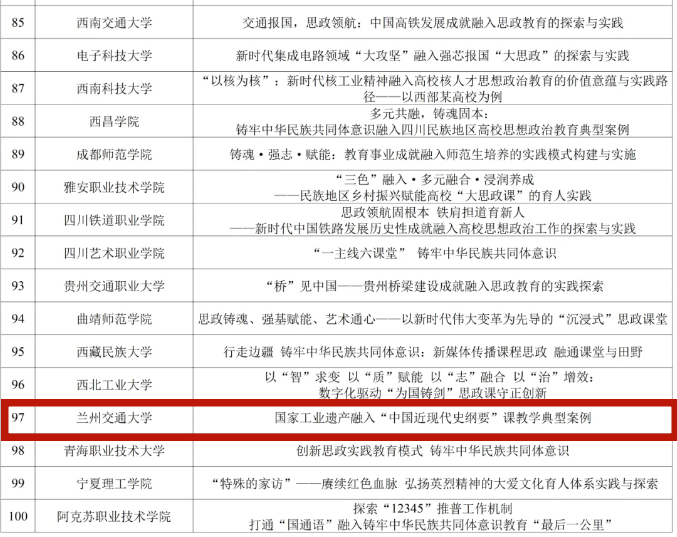 近日,教育部思想政治工作司公布了2025年度思想政治工作质量提升综合改革与精品建设项目遴选结果的公示名单,我校马克思主义学院高小强副教授主持申报的“国家工业遗产融入‘中国近现代史纲要’课教学典型案例”成功入围“2025年度新时代伟大变革融入高校思想政治教育典型案例”项目。此项目的成功入围,是我校在教育部思想政治工作质量提升综合改革与精品建设项目申报中取得的新突破,标志着我校在建设精品思政课工作中取得了阶段性新成果,为我校思想政治工作高质量内涵式发展提供了坚实支撑。