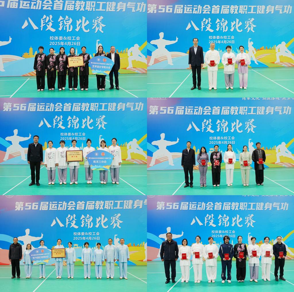 经过激烈角逐,最终艺术设计学院分会获团体赛冠军,机关三分会获团体赛亚军,电子与信息工程学院分会获团体赛季军,何红彬老师等3人获得个人赛一等奖,杨霞林老师等5人获得个人赛二等奖,段向雪老师等8人获得个人赛三等奖。颁奖仪式上,校领导为获奖集体颁发奖牌,为获奖个人颁发证书并合影留念。获奖代表们表示,通过此次比赛不仅强健了体魄,更深刻感受到中华传统文化的博大精深,未来将继续以实际行动践行“健康第一”的理念。