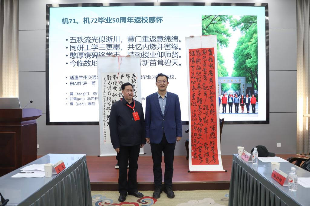 座谈会上,校友与母校互赠纪念品。机71庞福祥校友赠送自书的两幅书法作品,机72李镐镐校友代表段世岭同学献上创作的国画《锦绣前程》,三幅作品承载着校友对母校的眷恋与祝福。苏程代表学校回赠镌刻“凡我在处便是交大”的水晶帆船,寄语校友“无论走多远,母校永远是校友的精神家园;而校友的功绩,永远是母校最骄傲的勋章”。