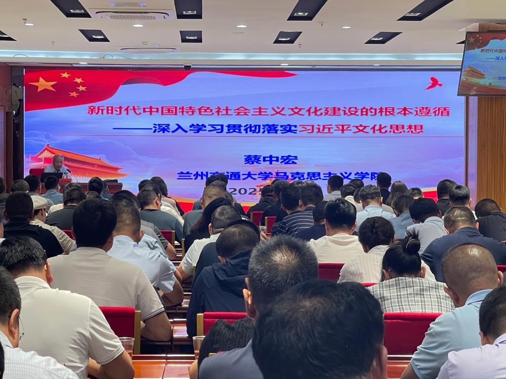 蔡中宏以《新时代中国特色社会主义文化建设的根本遵循——深入学习贯彻落实习近平文化思想》为题,从新时代中国特色社会主义文化理论与制度、新时代巩固和发展社会主义意识形态、培育和践行社会主义核心价值观、在传承发展中华优秀传统文化中推进文化创新、建设社会主义文化强国五个方面在康乐县委理论学习中心组习近平文化思想专题学习扩大会议上为康乐县县级干部、各乡镇党委书记、乡镇长及相关单位负责人共计160余名干部作了专题宣讲。